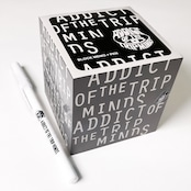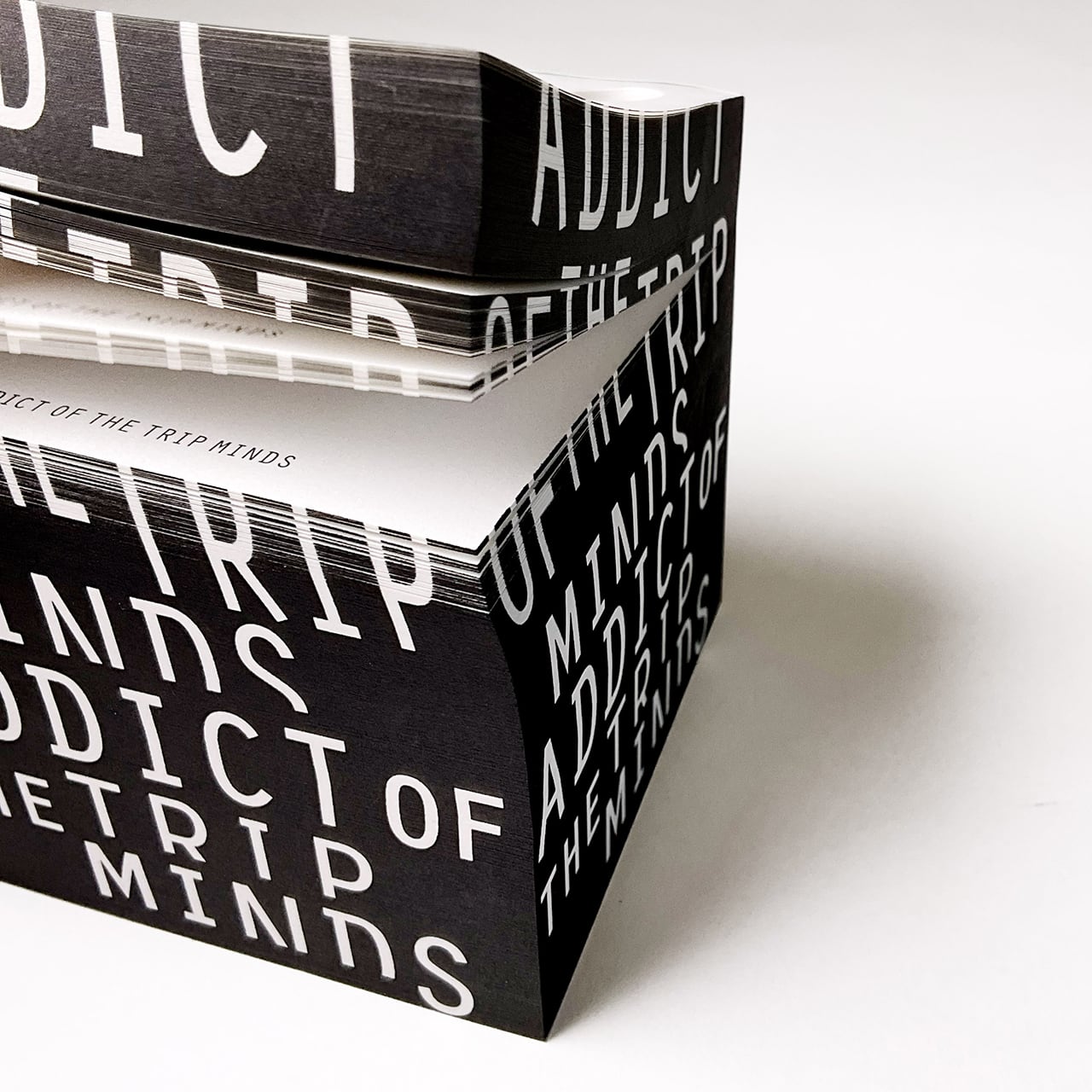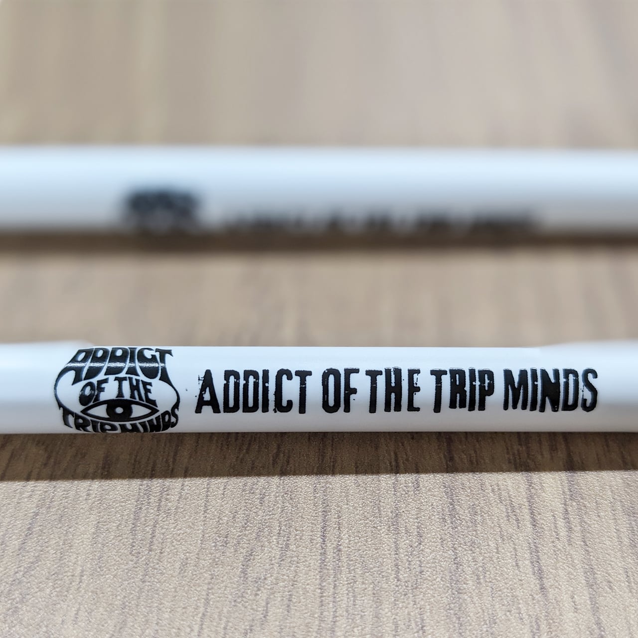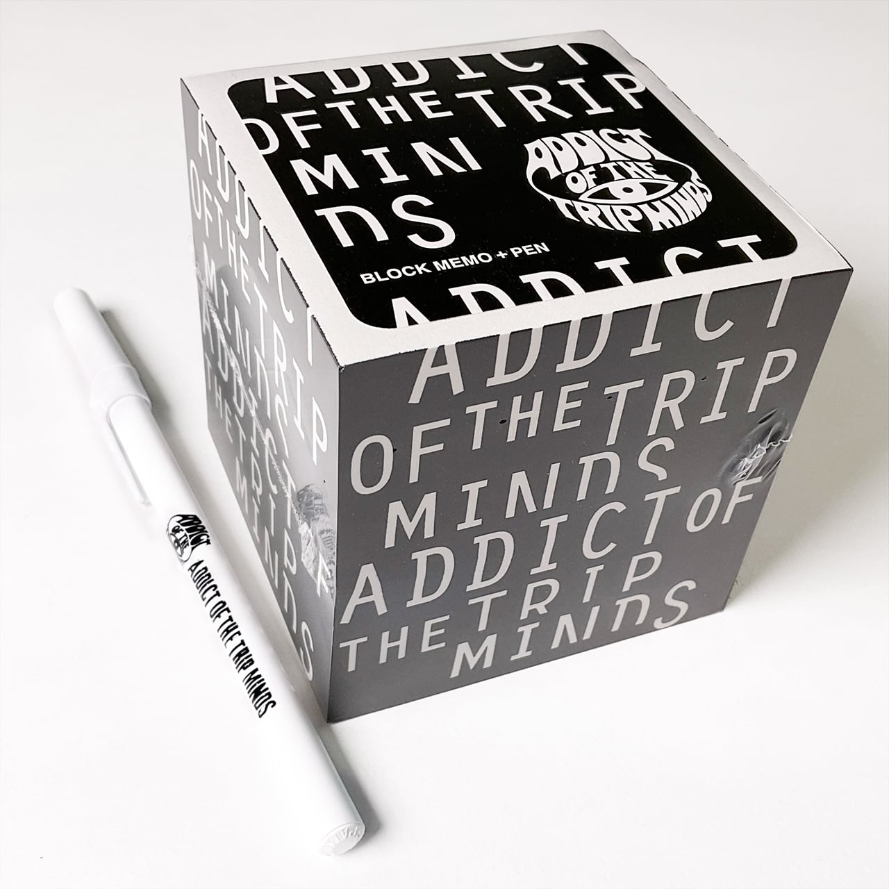 ブロックの4側面(紙の積層面)にグラフィックが入り、メモ面は薄いグレーのADDICT EYEマークが入ります。ボールペンが立てられるペン穴付き。使用することで上から減っても、下層面までADDICTの文字が入っているので、デザインを長く楽しむことが出来ます。ボールペンは定番のbic社ラウンドスティックの黒。ペンにもADDICTロゴが入ります。